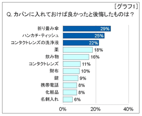 さらに、「カバンに入れておけば良かったと後悔したもの」について聞いたところ、普段携帯する人が非常に少なかった「コンタクトレンズの洗浄液」(22%)が、TOP3にランクイン。1位「折り畳み傘」(29%)、2位「ハンカチ・ティッシュ」(25%)との差も、僅かでした。[グラフ1]