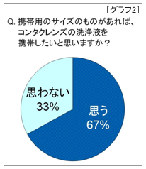 次に、「コンタクトレンズの洗浄液の携帯」について聞きました。これに対し、「かさばるので、持ち歩くのが面倒だと思う」という人は82%。また、「携帯用のサイズのものであれば、携帯したいと思う」という人は67%にのぼりました。[グラフ2] コンタクトレンズの洗浄液がカバンに入れてもらえない理由の一つとして、携帯時の煩わしさがあるようです。