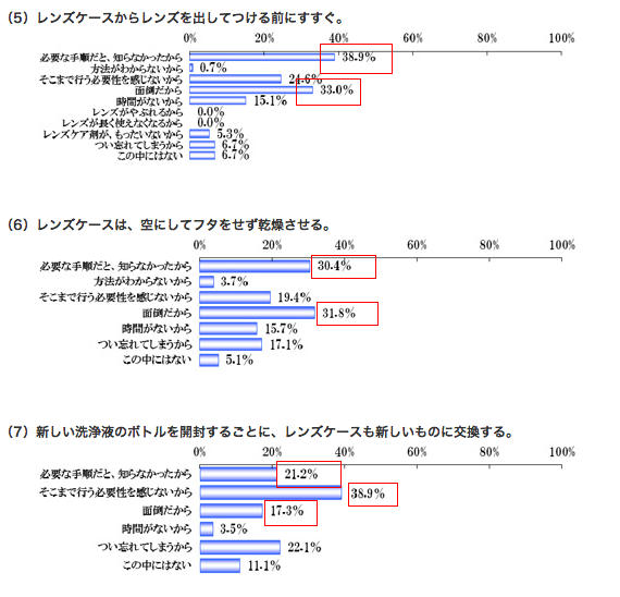 最初に「せっけんでよく手を洗う」という基本的な手順も、全体の半数以下 しか実施していないなど、ユーザー自身の意識と、実際に行っているレンズケアには、大きなギャップがあるという調査結果となりました。