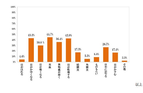 その症状の具体的な内訳は、最も多いのが「充血」(44.7%)、次いで「目がかゆくなる」(43.3%)以下「目が乾燥する」(42.9%)、「異物感が続く」(36.4%)、「目が痛くなる」(30.0%)、「目やにが出る」(26.7%)、「結膜炎」(17.5%)等の順となっています。