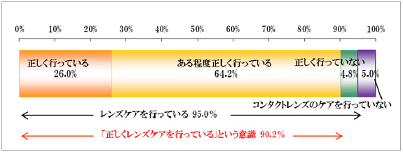 “自身が正しくレンズケアを正しく行っているか”の質問に対しては、「正しく行っている」26.0%、「ある程度正しく行っている」64.2%と合わせて90.2%が「レンズケアを正しく行っている」と答えており、自身の“正しくレンズケアを行っている”という意識が非常に高いことがわかりました。