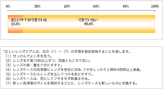 ところが、実際に正しいレンズケア(後述の(1)~(7)を毎回実践)をできている人は、10.0%と10人に1人であり、高い意識とは裏腹に実は10人中9人は正しくレンズケアができておらず、ケアしている“つもり”であることが調査結果から浮き彫りになっています。