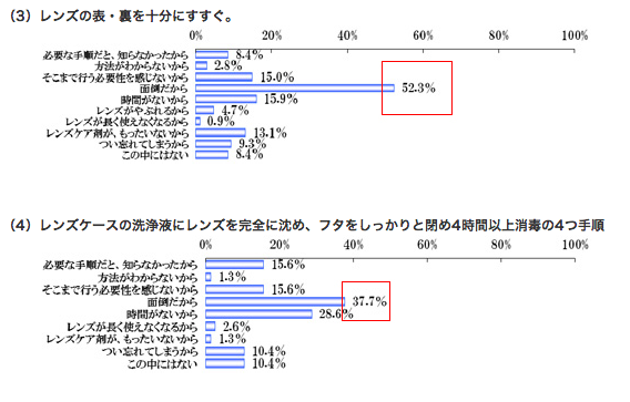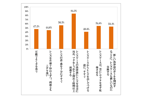 「正しくレンズケアを行っている」と自覚している人の中で、84.3%が「レンズの4時間以上の消毒」については実践しているものの、「せっけんで手をよく洗う」というケアの1つ目の手順では、47.2%とほぼ2人に1人しか行っていないほか、レンズの汚れを落とすのに重要である「レンズの片面10秒以上ずつ、両面のこすり洗い」という手順でも44.6%しか行なっていないという結果になっています。