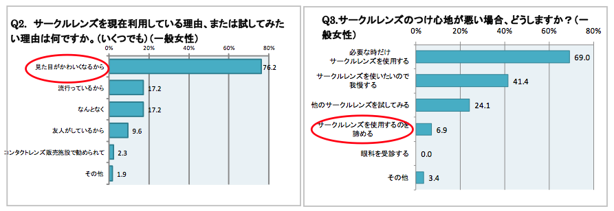 女性のコンタクトレンズユーザーのうち、15.1%が現在サークルレンズを使用しており、35.5%が現在は使用していないが、今後使用したいと回答している(Q1)。 コンタクトレンズユーザーの約半数が、サークルレンズに好意的といえる。今は使用していないが過去に使用していた人も考慮すると、6割以上が、今までにサークルレンズに興味をもった事があることになる。 支持される主な理由は、「見た目がかわいくなるから」である(Q2)が、「サークルレンズのつけ心地が悪いと感じたら、サークルレンズを諦める」と答えたユーザーは6.9%しかいない(Q3)。かわいくなるためには、つけ心地には目をつぶるようだ。