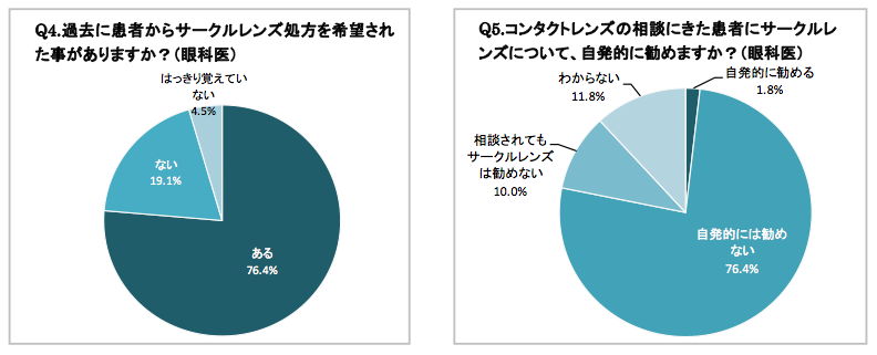 眼科医の約76.4%が患者からサークルレンズの処方を希望された経験がある(Q4)が、サークルレンズを患者に勧める意識は非常に低い。大半の眼科医は自発的には勧めない傾向があり、中には相談されても勧めない、と答える医師が10%いた(Q5)。「よく見える」や「快適」を重視して通常のコンタクトレンズが望ましいと思う医師と、多少つけ心地が悪くてもサークルレンズをつけたいと思う患者の意識には大きな隔たりがあるようだ。