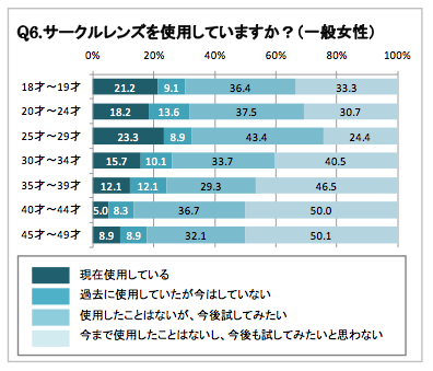 サークルレンズ使用者は、女性のコンタクトレンズユーザーの20代、30代を中心に増えているが、40代においても、約3割が今後使いたいと答えており、その割合は、30代と大きくはかわらない(Q6)。現在使用している人と併せると、現時点で40代の約4割がサークルレンズに好意的である。