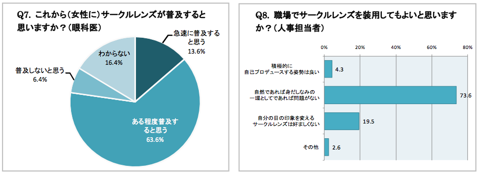 眼科医の77.2%も、サークルレンズは今後更に普及すると考えている(Q7)。 さらに、人事担当者は73.6%が、「身だしなみの一環としてであれば社内でつけても問題ない」と回答している(Q8)。幅広い年代から支持されるサークルレンズは、職場でも自然なものであれば普及していくと考えられる。