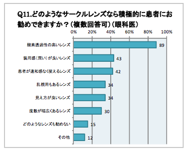 サークルレンズが普及するというコンタクトレンズの市場の変化を予測しながら、「酸素透過性の高いサークルレンズ」であれば医師の8割が、「装用感(潤い)が良いもの」や「患者が違和感なく使えるもの」であれば4割が、積極的に勧めると回答している(Q11)。医師は、普及するサークルレンズも選択肢の1つとして考え、患者に寄り添った診察を検討する時期にあると思われる。