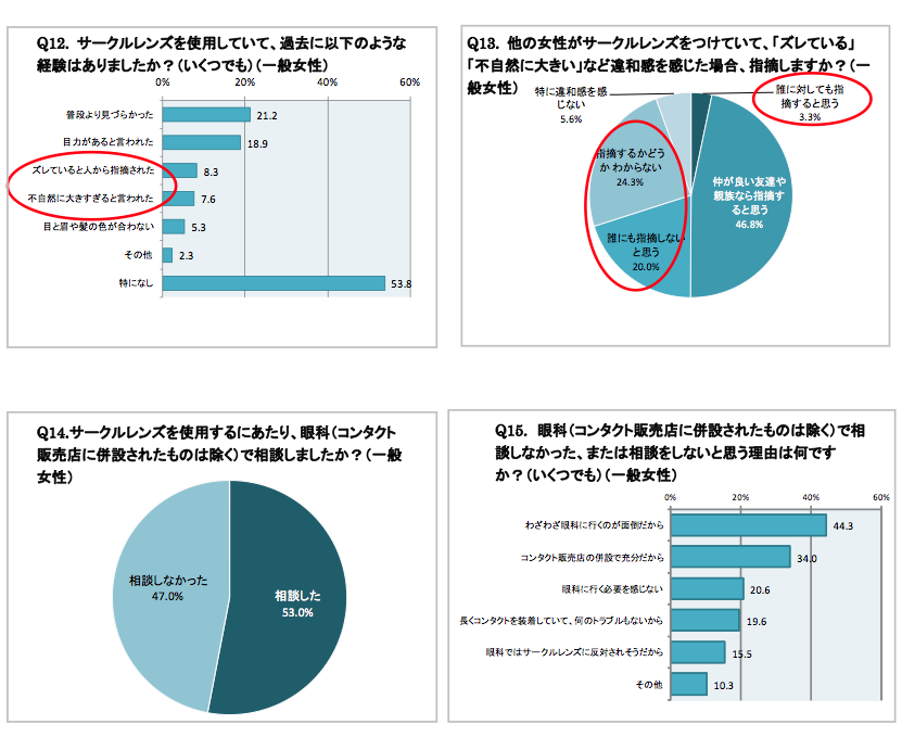 サークルレンズを使用していて他人に「ズレている」、「不自然」といわれた経験がある女性は、7~8%程度でしかなかったが(Q12)、親族や仲の良い友人以外の誰に対してでも指摘してくれる人はたったの3.3%しかいない。 指摘しない、または指摘するかわからない、といった、指摘することに積極的とは言えない人は、約4割いる(Q13)。 もしかしたら、周囲は言葉に出さずとも、内心「ギョッ」としているかもしれない。サークルレンズ使用者のうち、半数近くは眼科医に相談せず使用を開始しており(Q14)、4割が「眼科に行くのが面倒」、2割が「行く必要を感じない」と答えている(Q15)。サークルレンズの使用に対する眼科医のアドバイスは、通常のコンタクトレンズと比べるとあまり重要視されていないようだが、眼科では、医師が品質やズレないかなども含め、多種多様なサークルレンズの中から、自分に合うものアドバイスしてくれる。複数のレンズをフィッティングし、医師のアドバイスのもと、自分にあったサークルレンズを選ぶのが賢い選択肢と言えそうだ。