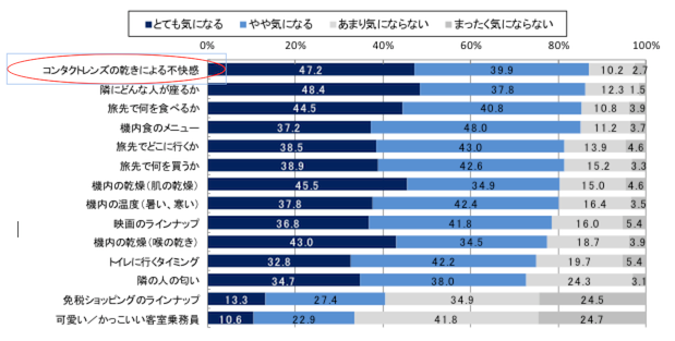 「コンタクトレンズの乾きによる不快感」が第1位。飛行機内では、「隣にどんな人が座るか」、「機内食のメニュー」など機内のこと、「どこに行くか」、「何を食べるか」など旅行のことよりも、コンタクトレンズの乾きを気にしている。