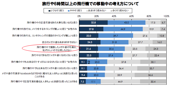 「飛行機の中の記念写真も旅の大事な思い出」と思う人は多いが、「飛行機の中で撮影したメガネ姿の写真は恥ずかしいので公開したくない」という人が約半数いる