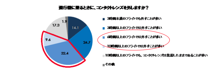 6時間以上のフライトでコンタクトレンズを外す人が42%いる一方で、10時間以上のフライトでも外さない人は17.3%存在する。